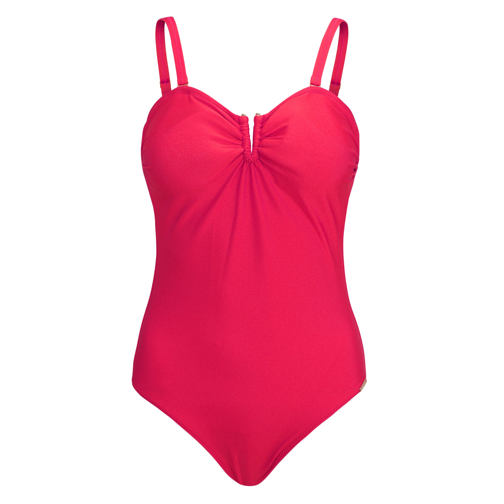 El bañador de la serie Mazzarino cuenta con tirantes desmontables y puede llevarse sin hombros como bañador bandeau. Un accesorio metálico en color dorado, situado en el centro delantero, dispone el tejido en elegantes pliegues. El fruncido resultante y el pequeño escote crean un atractivo punto focal, al tiempo que contribuyen a un ajuste favorecedor. Las copas integradas moldean suavemente el pecho. Los tirantes desmontables permiten un bronceado sin marcas en los hombros y ofrecen múltiples opciones de uso.