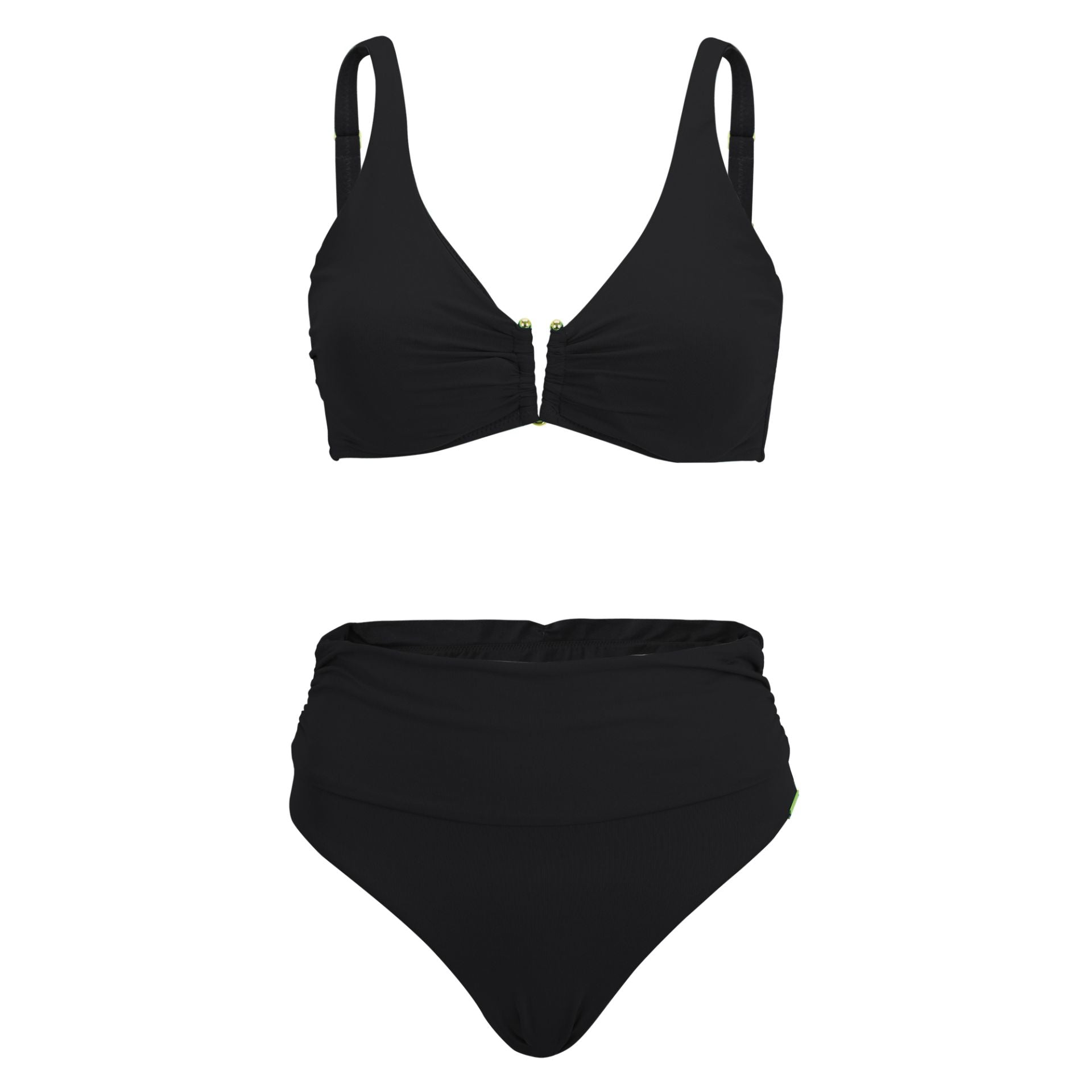 El bikini de la serie “Soft Touch” irradia un estilo discreto en un elegante negro clásico. La parte superior del bikini está fruncida en los laterales y en el centro, lo que visualmente aporta más forma y volumen. Un accesorio dorado en el centro del top atrae las miradas con un toque de “bling”.